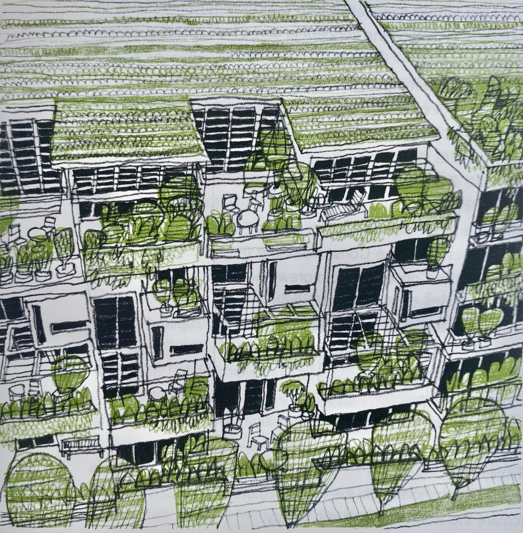 For the Garden Apartments building that I designed as NSW Government Architect, the aim was to have large balconies for plants, trees in the street and a checkerboard elevation that represented individual homes. Illustration, Mark Gerada.
