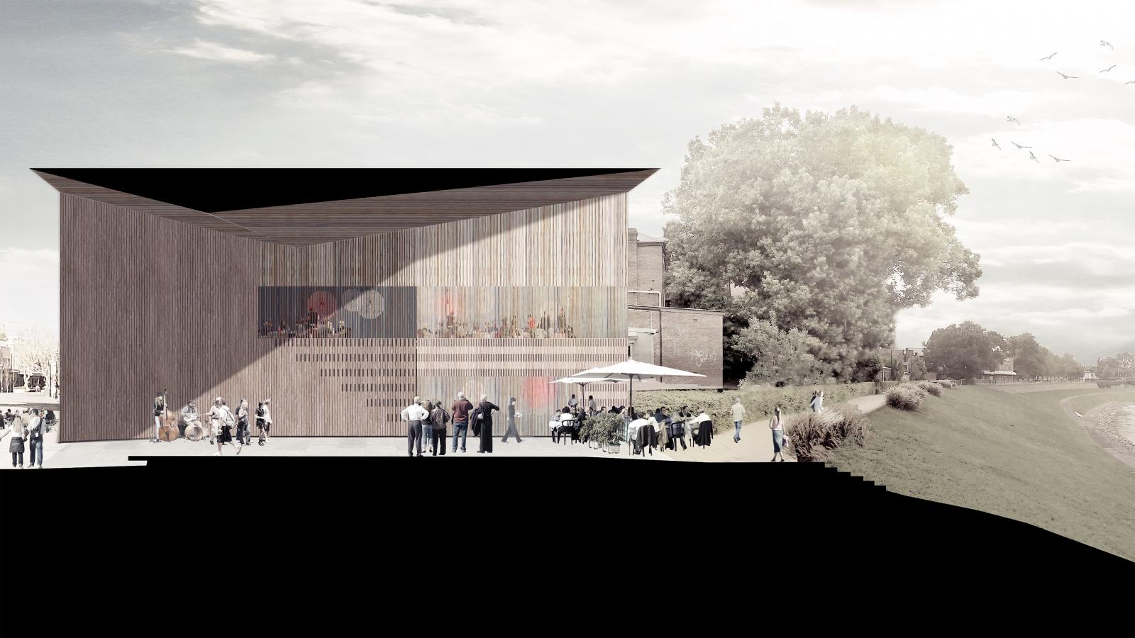 - Cross-sectional drawing through the Riverlink gateway structure: This shows profile of the site contouring, and the built and natural relationships from main street through to the waterfront. Note the voluminous space of the gateway building and, by contrast, the finely detailed internal elevation that breaks down the scale.