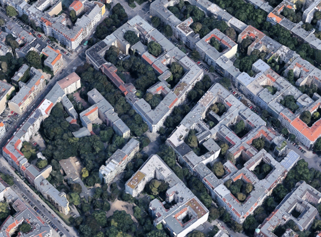 But when we compare this to a solid looking European building block, we might be surprised to learn that buildings only line the edges against the streets, but that inside the block there is a green courtyard.