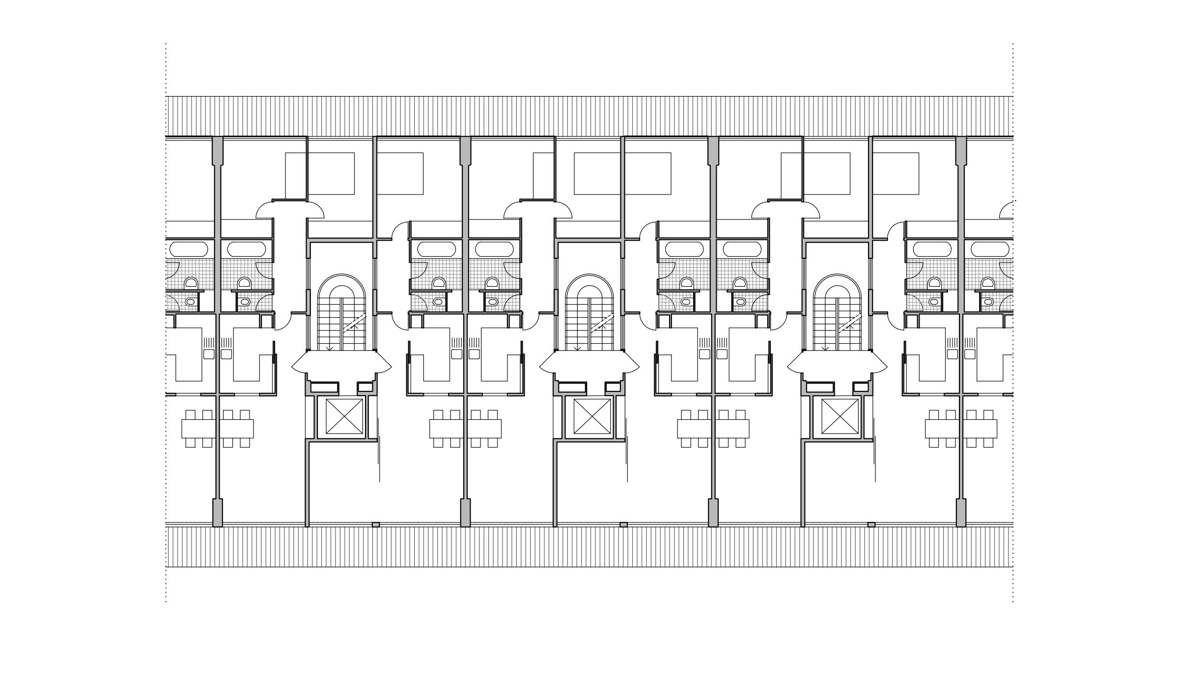 The ideas expressed in the Zaanhof and other surrounding courtyard blocks within Van der Mey’s scheme were taken to an even more extreme expression in the Viennese superblocks, resulting from the municipal programme in the interbellum period to build affordable housing for the impoverished urban working class of Vienna. In the Rabenhof, the individual building block has been completely dissolved, becoming part of one continuous structure of meandering housing that defines an almost labyrinthine sequence of connected streets, squares, courtyards and gardens. Remarkably, this richly layered spatial differentiation is combined with a complete lack of differentiation in the housing. The 1100 units of the Rabenhof all follow the same basic typology of three two-room units around one staircase, only adapting to the irregular megastructure when unavoidable. More famous, but certainly less innovative from an urbanistic point of view, is the Karl Marx Hof, designed and built very shortly after the Rabenhof project. Here, the open form and sensitive anchoring in context of the Rabenhof is replaced by the very strong autonomous form of two very large, closed building blocks connected by a central part with giant open arches. The units themselves are identical to those of the Rabenhof, once more showing the clear disconnection between urban morphology and dwelling typology of the Viennese projects. The Italian critic Manfredo Tafuri considered the Viennese projects in his study Vienna Rossa, published in 1980, as embodying a conflict between technique, ideology and form – and as hopelessly regressive from a typological point of view.