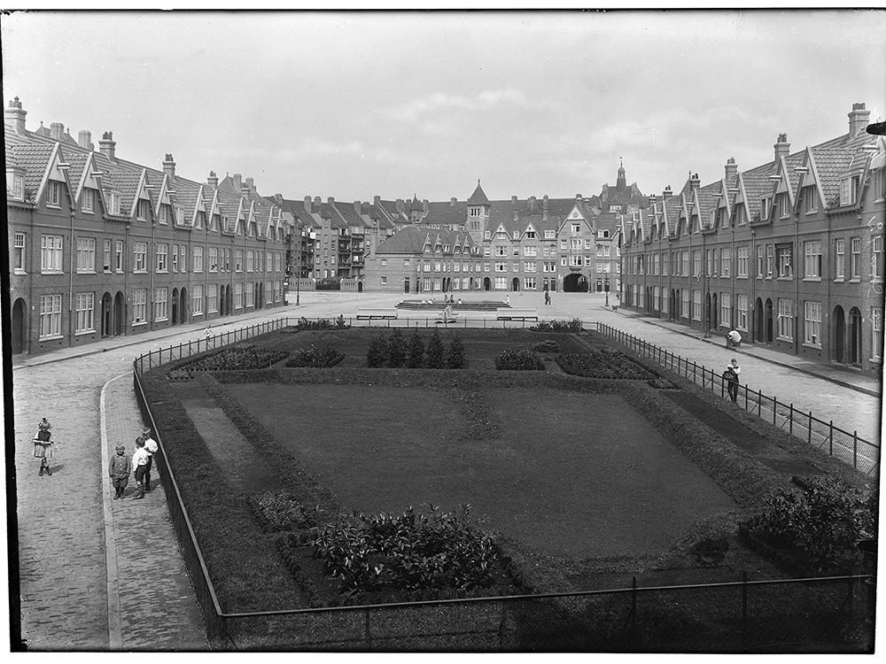 In several early large-scale residential projects, one can see other balances between traditional patterns and innovative ideas. The Zaanhof was part of a masterplan for the Spaarndammerbuurt, an early 20th-century residential extension for the working class in Amsterdam West designed, along with Herman Walenkamp, by Joan van der Mey, protagonist of the Amsterdam School movement that produced iconic housing projects such as De Dageraad in Amsterdam South. For the Spaarndammerbuurt, Van der Mey proposed a radically new urban structure, abandoning the ubiquitous grid structure of the 19th-century European city. Large, irregularly shaped building blocks define a clearly differentiated system of streets, communal courtyards, and collective and private gardens. The housing itself followed traditional patterns of residential typologies and construction methods, but the narrow and long building blocks of 19th-century Amsterdam were transformed into ‘superblocks’, with a double ring of housing – the outer one facing the public streets, the inner ring surrounding a collective green space – that demonstrates a striking parallel with the contemporary suburban, or even anti-urban, idea of the garden city as seen in Hampstead Garden Suburb or the Papaverhof.