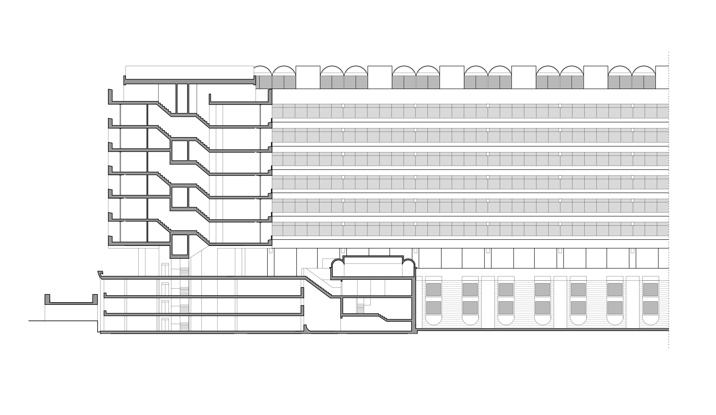 - Barbican, London, UK, 1959, designed by Chamberlin, Powell and Bon. Section-elevation.