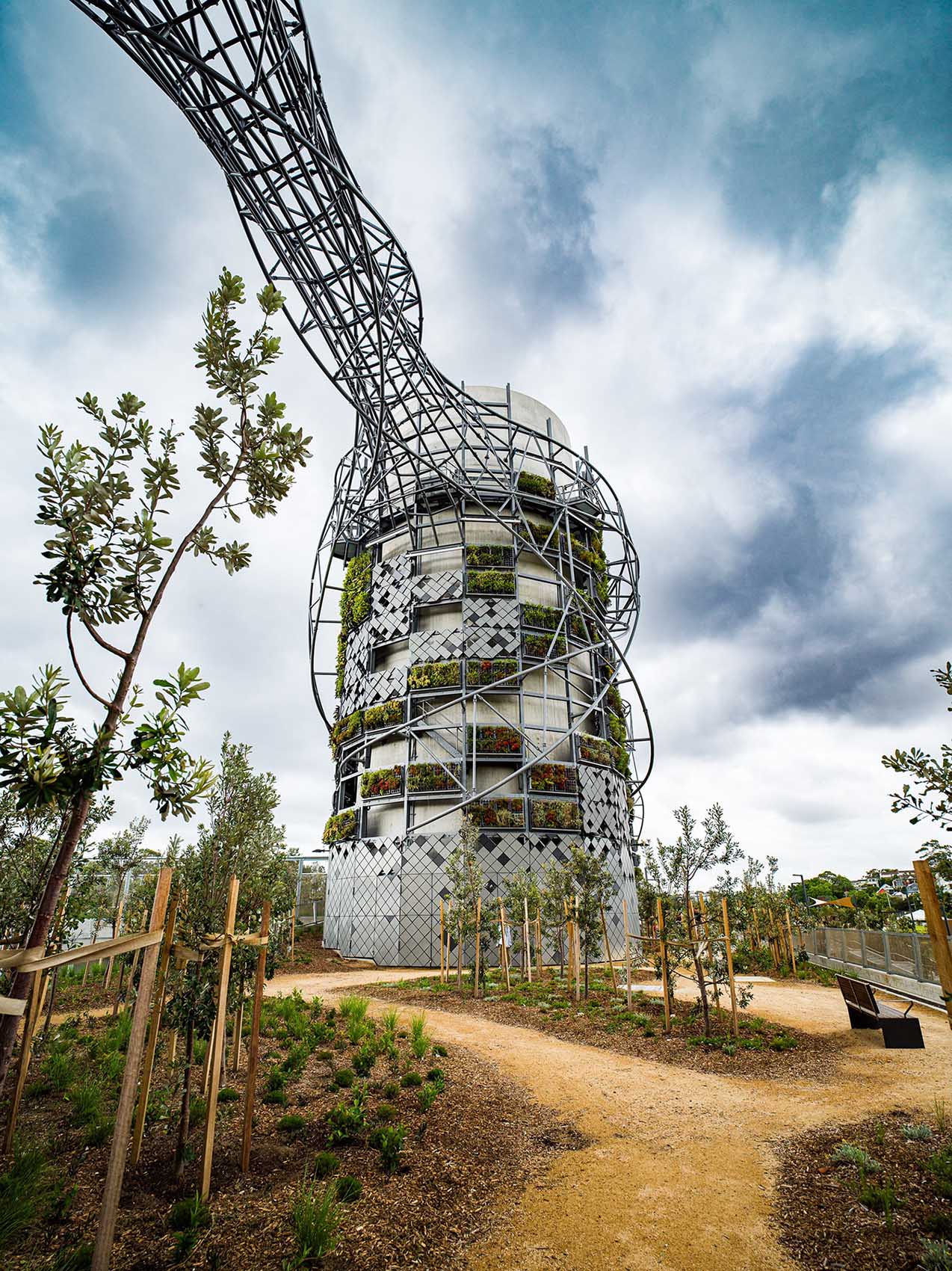 The ventilation towers, which are experienced through transport movement, by pedestrians and park users, are thereby broken down, softening their form against the skyline and integrating them into the parkland. They present a new, dynamic, skyline.