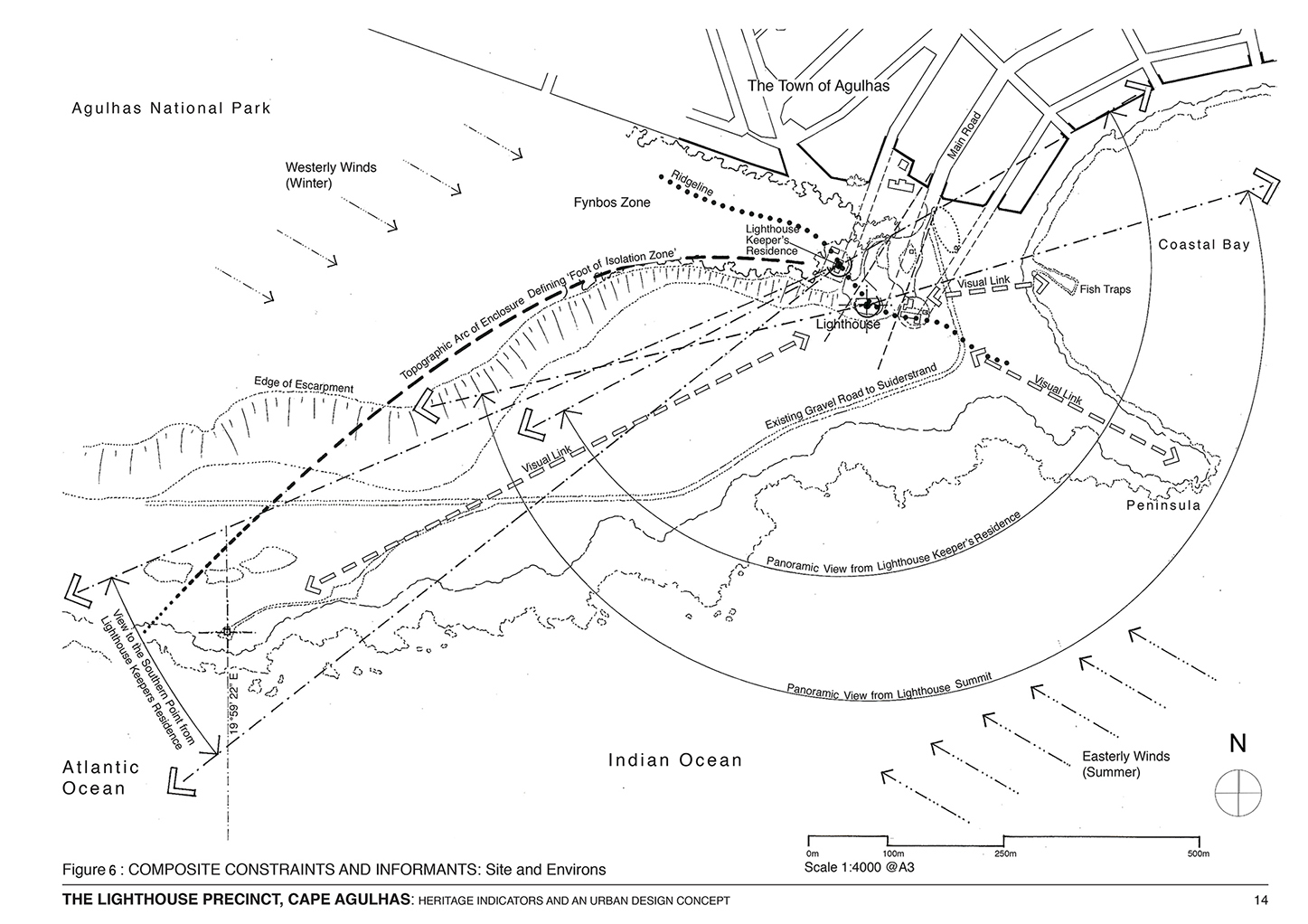 Figure 7 shows composite constraints and informants at the scale of the lighthouse precinct. Shown here is the lighthouse complex; the obtrusive lighthouse-keeper’s accommodation; the caves and the rock features to the west; two important milkwood groves to the north; the existing SANParks offices and information centre; the grave of the daughter of one of the lighthouse-keepers; two shell-middens zones (one to the north and one to the south); the original well to the east which made human habitation possible; and the fish traps which are of considerable archaeological significance. Also shown are the four main visual and physical links; the geological types which influence character; prevailing winds; the main pedestrian approach to the lighthouse; and the dominant ridgeline which impacts on visual permeability.